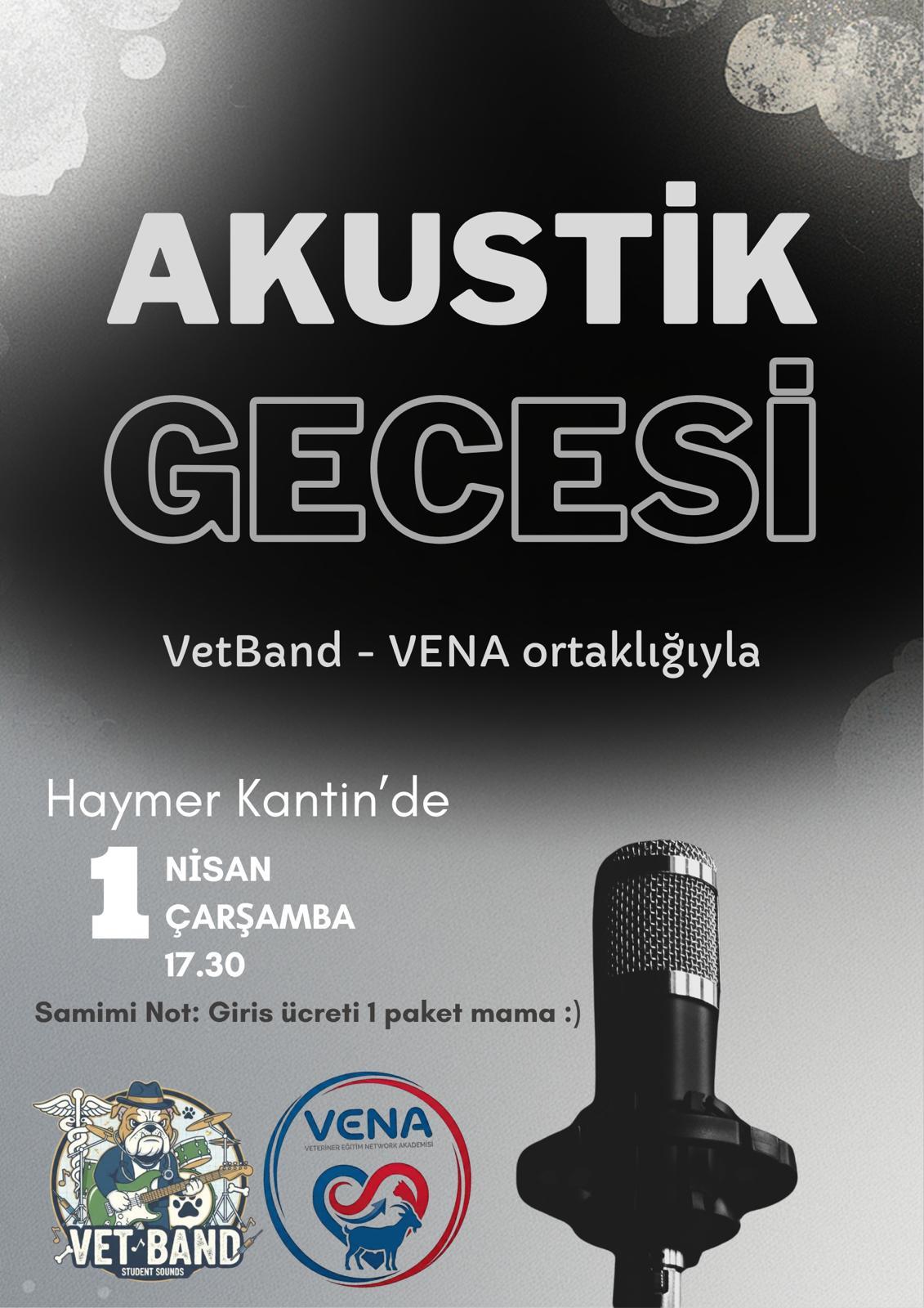 Fakültemiz öğrenci toplulukları VetBand ve VENA tarafından düzenlenen Akustik Gecesi etkinliği, 1 Nisan Çarşamba günü saat 17.30’da HAYMER Kantini’nde gerçekleştirilecektir.