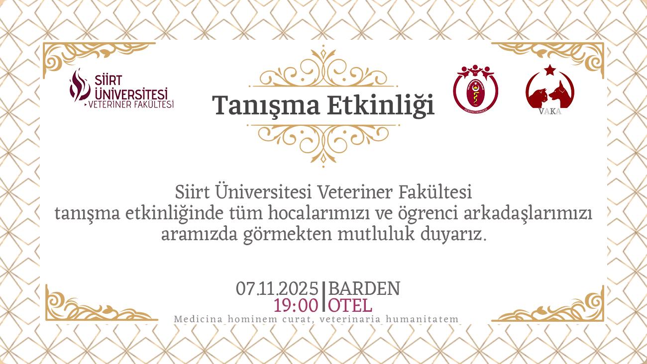 Siirt Üniversitesi Veteriner Fakültesi, 2025-2026 eğitim-öğretim yılı kapsamında öğrenciler arasındaki iletişimi güçlendirmek ve fakülte içi birlikteliği pekiştirmek amacıyla bir “Tanışma Yemeği” düzenledi. Fakülte akademik ve idari personeli ile tüm sınıf düzeylerinden öğrencilerin katılım gösterdiği etkinlik, samimi ve sıcak bir atmosferde gerçekleşti. Program, müzik dinletisi ve sohbet eşliğinde keyifli anlarla sona erdi.